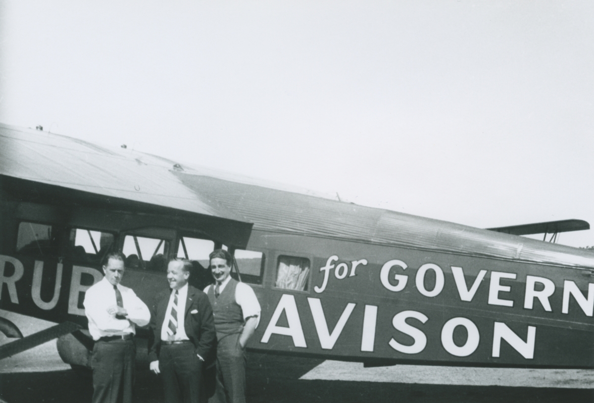 Fotografi från låda märkt Bernt Balchen. Balchen var norsk-amerikansk flygare, polarforskare och militär. Motiv av tre män som står framför flygplan.