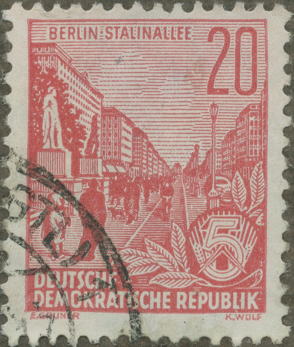 Frimärke från Öst Tyskland, 1955. Motiv av Stalinalléen i Berlin