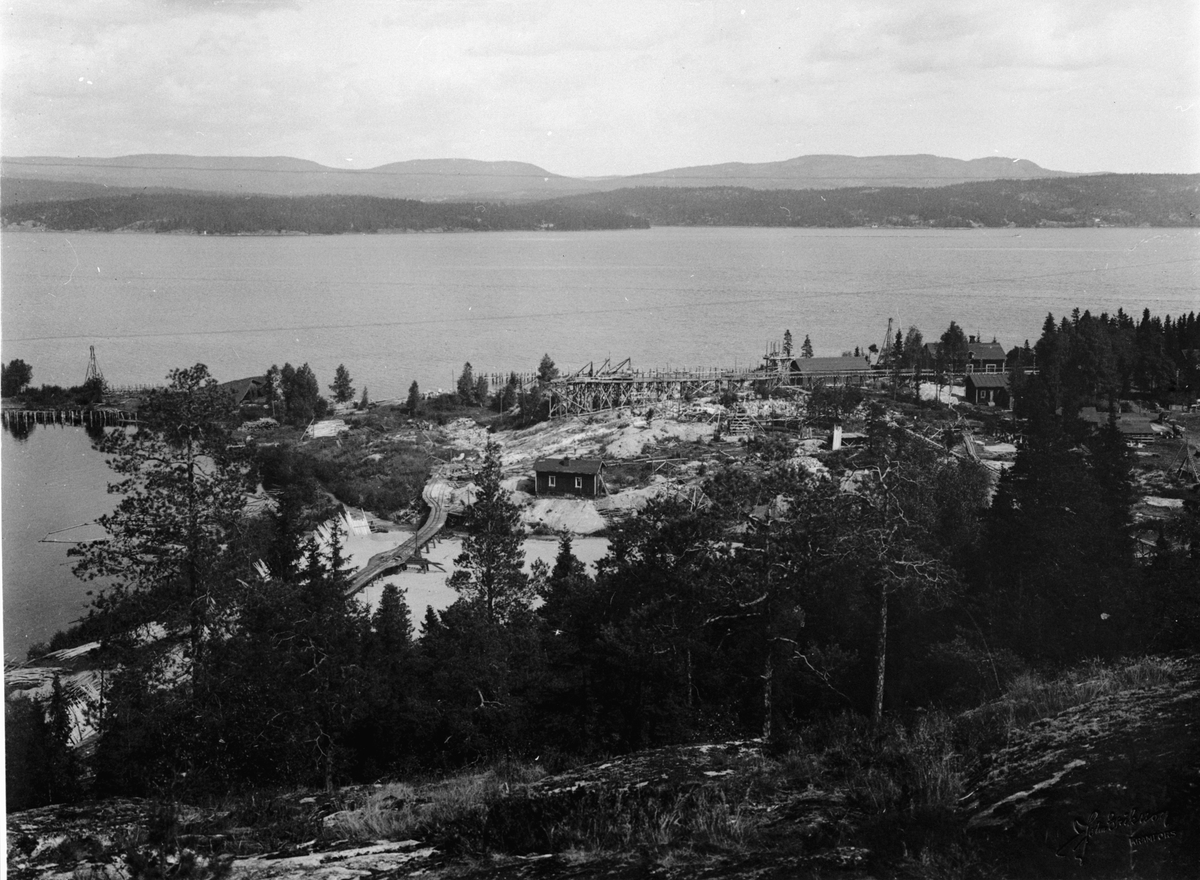 Titel: Byggherre: Byggnadsaktiebolaget Contractor, Stockholm. Sulfatfabrik i Dynäs i Ådalen för Sandvikens Cellulosa AB. Entreprenaden innefattade fabriksbyggnader, pir och massamagasin. Arbetsbild.