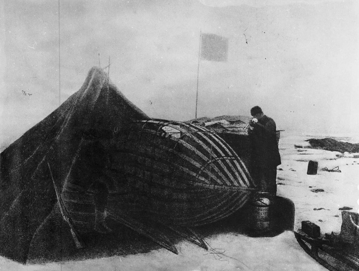 Den 15 - 19 juli 1897. Lägret vid "Örnens" landningsplats. Arbete med montering av båtens stomme. Framtagning av bilderna gjordes av docent John Hertzberg år 1930 på Fotografi, Tekniska Högskolan.