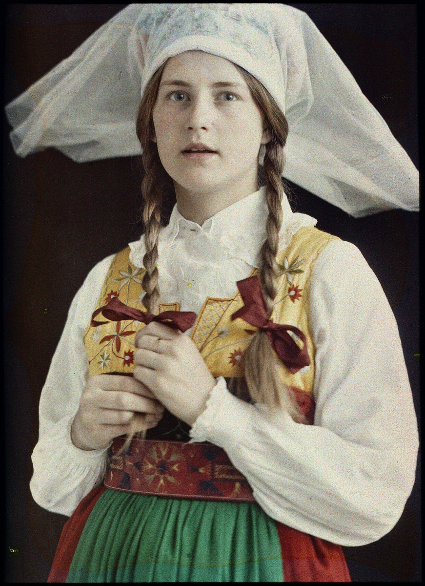 Agfa-autokrom. Serie "Margit". Porträtt av flicka i vingåkersdräkt.