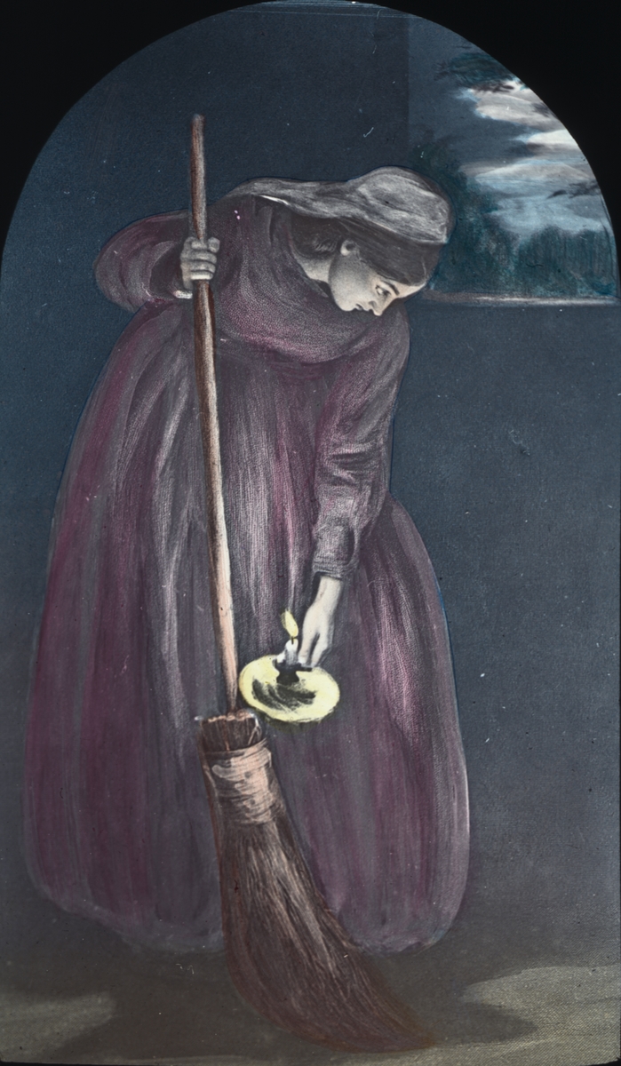 Kolorerad skioptikonbild med religiöst motiv. Kvinna med sopkvast.
