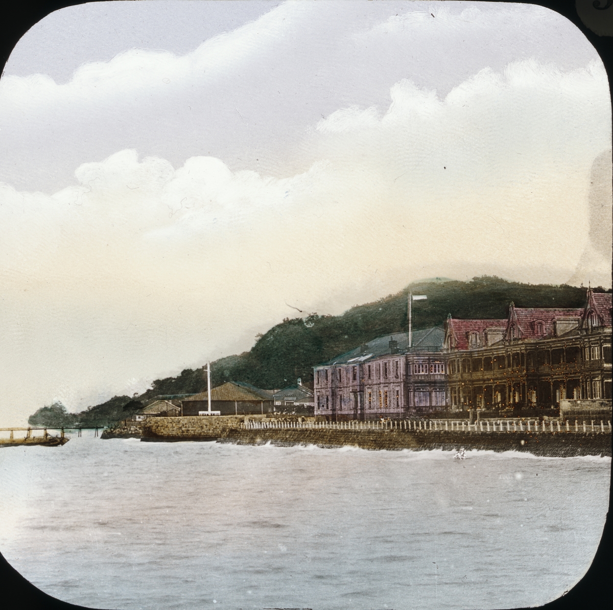 Kolorerad skioptikonbild med motiv av mindre hamn.