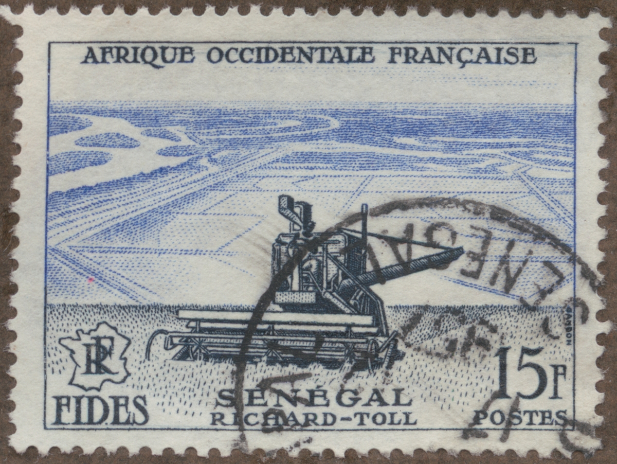 Frimärke från Franska Västafrika, 1956. Motiv av Stor skördemaskin i arbete Senegal
