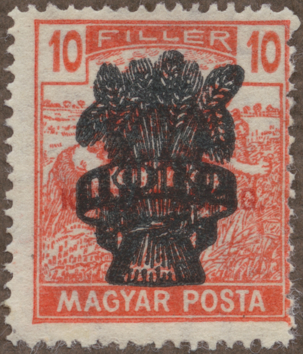 Frimärke från Ungern, 1920. Motiv av Sädeskärve Lantbrukssymbol (1919-20 märke med svart överstämpel)