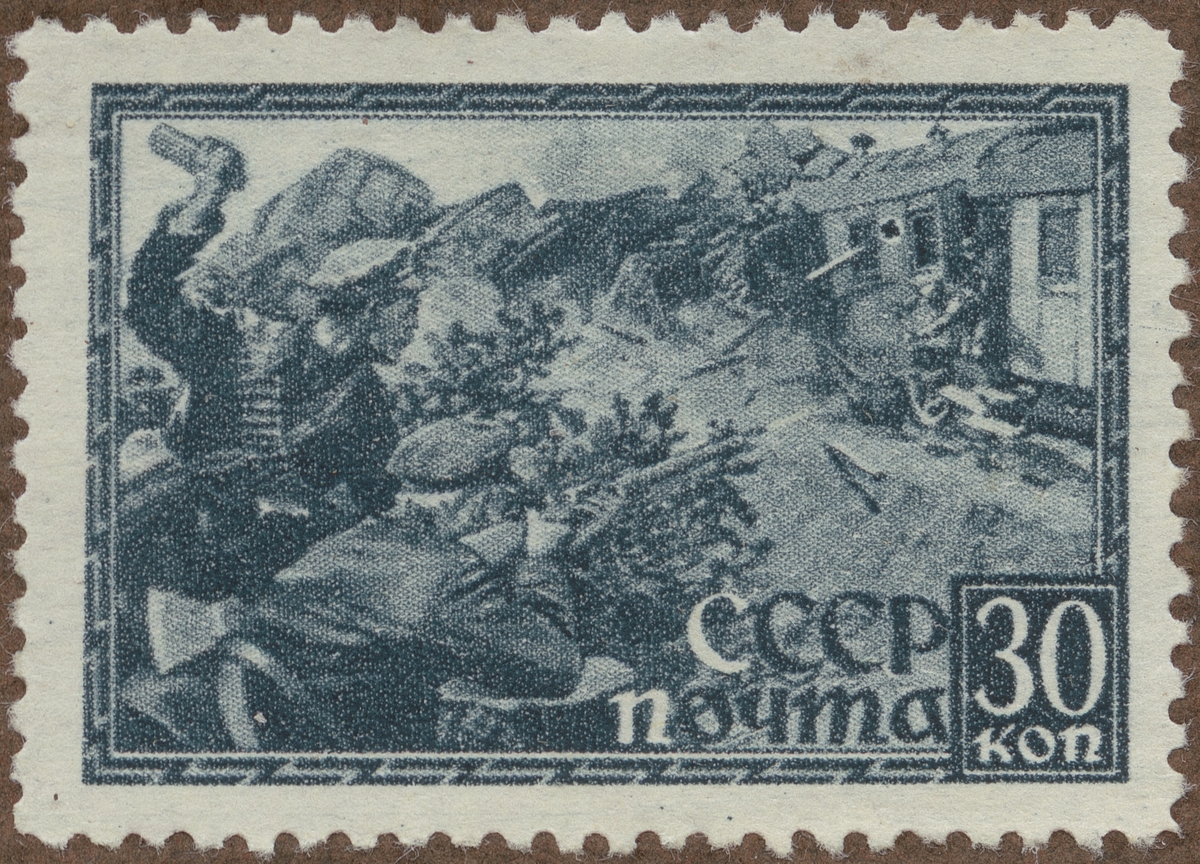 Frimärke från Ryssland, 1943. Motiv av Ryska Partisaner i verksamhet Gevär och Handgranater