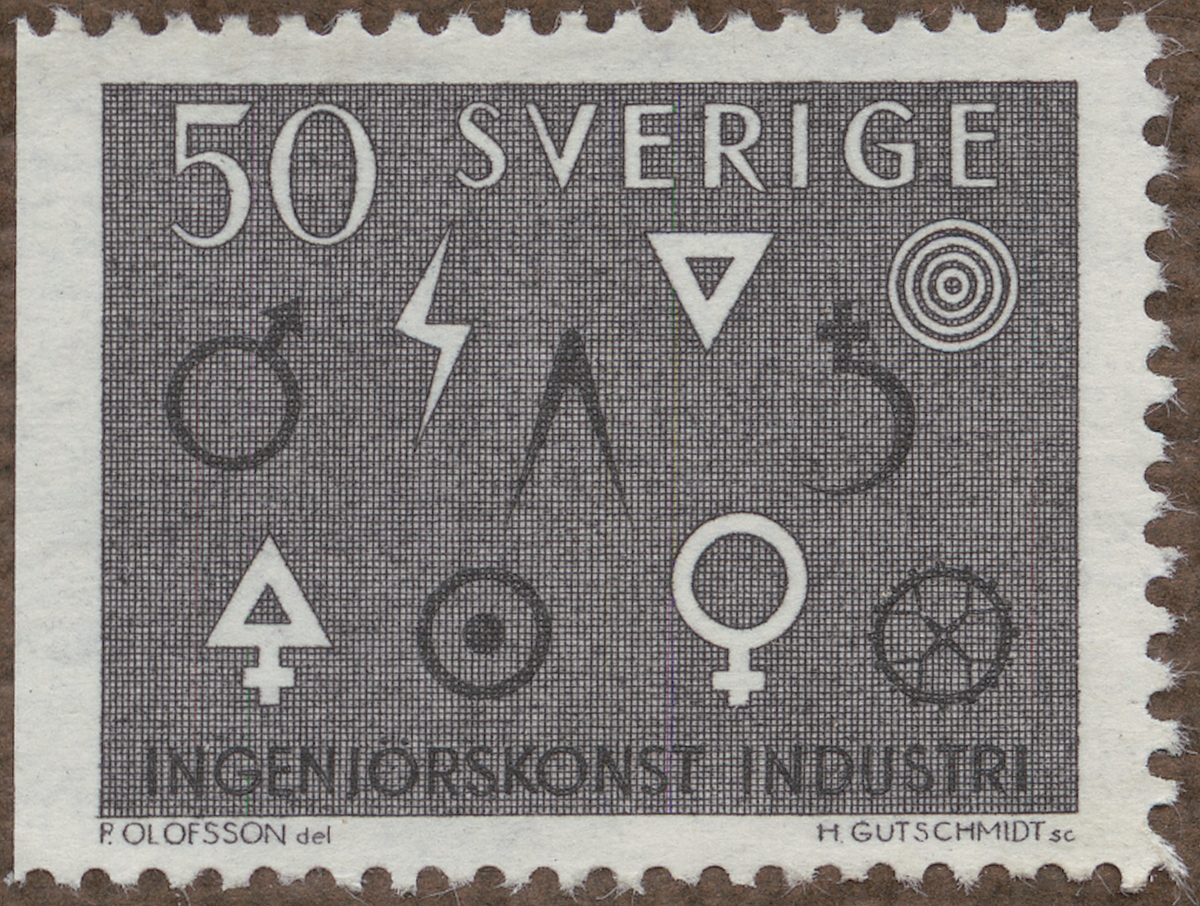 Frimärke från Sverige, 1963. Motiv av Cirkel med pilspets uppåt och andra 3000-år gamla symboler för svensk industri och ingeniörkonst. Cirkel med pilspets uppåt är det kemiska tecknen för järn som alkemister och kemister använde.