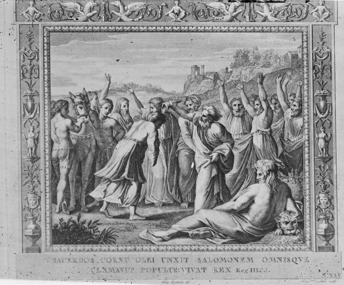 Skioptikonbild. Tryck med motiv av prästen Sadok och profeten Natan smörja Salomo till konung över Israel ochh fick alla människor utropa: Leve Konungen.