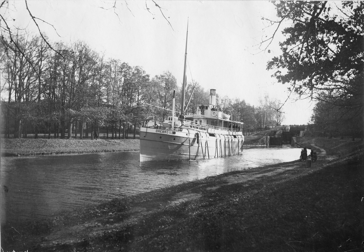 Kanalbåten Örebro II vid Hällby slussar i Hjälmare kanal, 1910. Bild från tidskriften Hemmets bildmaterial.