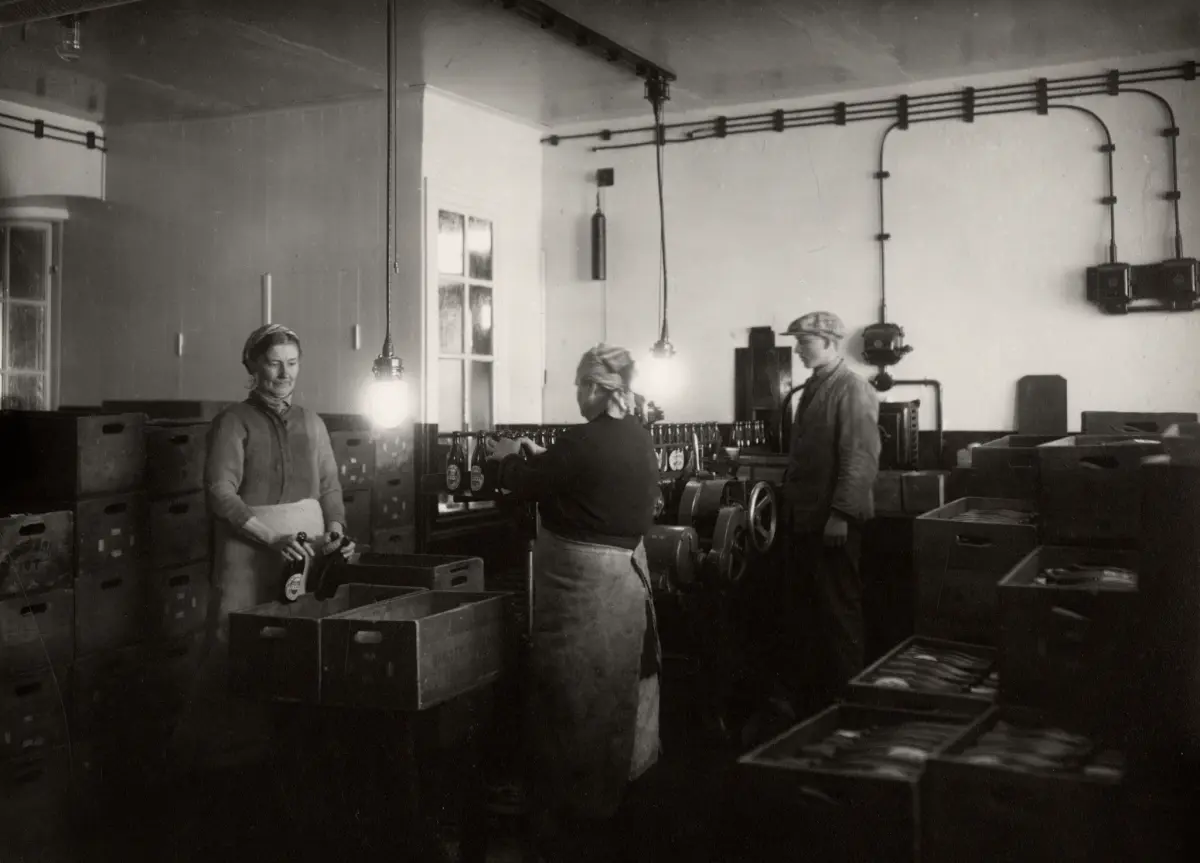 Nyköping Bryggeri Aktiebolag. Etiketteringsmaskin och avsyning av tappat öl.