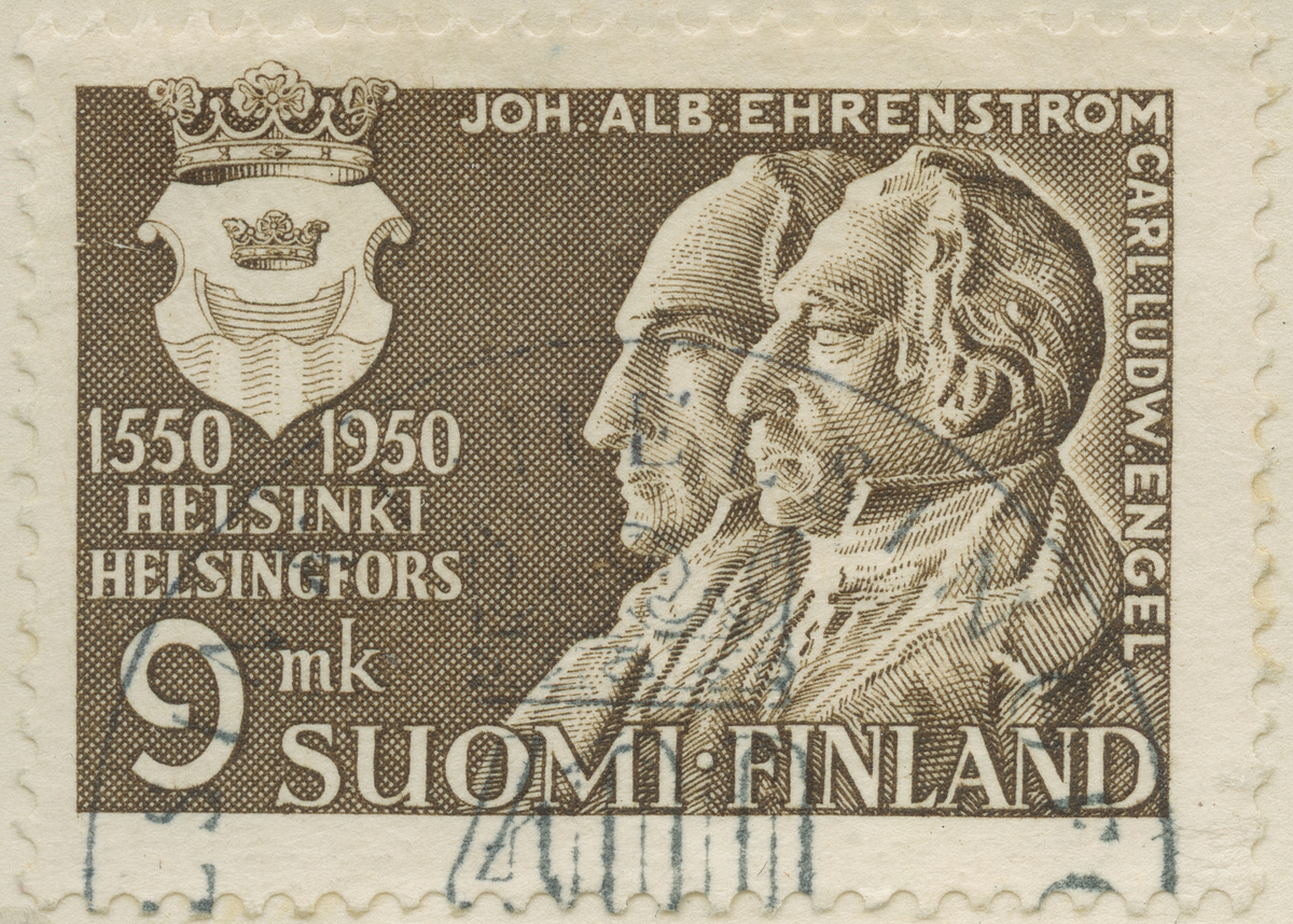 Frimärke från Finland, 1950. Motiv av arkitekterna Johan Albrecht Ehrenström, 1762-1847. (Finland) och Carl Ludwig Engel (Tyskland). Arkitekter efter Helsingfors brand 1808. "Helsingfors 400 år: 1550-1950".