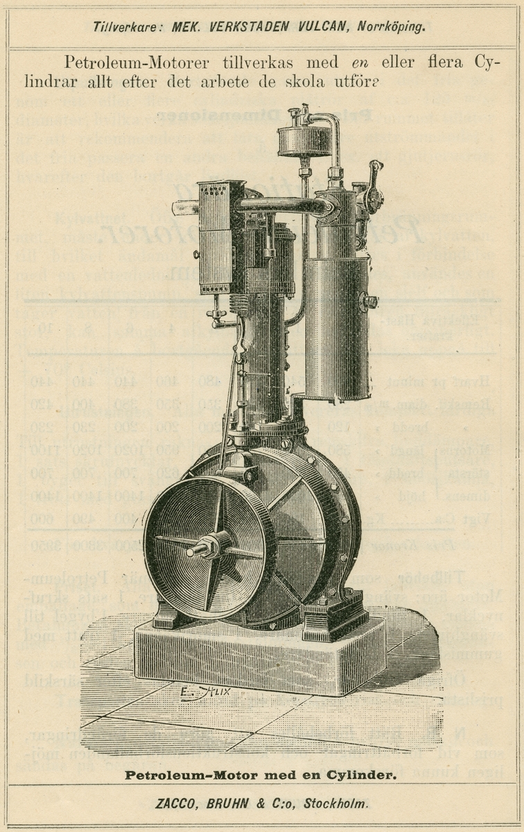 Bild ut Produktkatalog för Daimlers Patenterade Petroleum-Motorer tillverkade av Aktiebolaget Mek. Verkstan Vulcan i Norrköping.