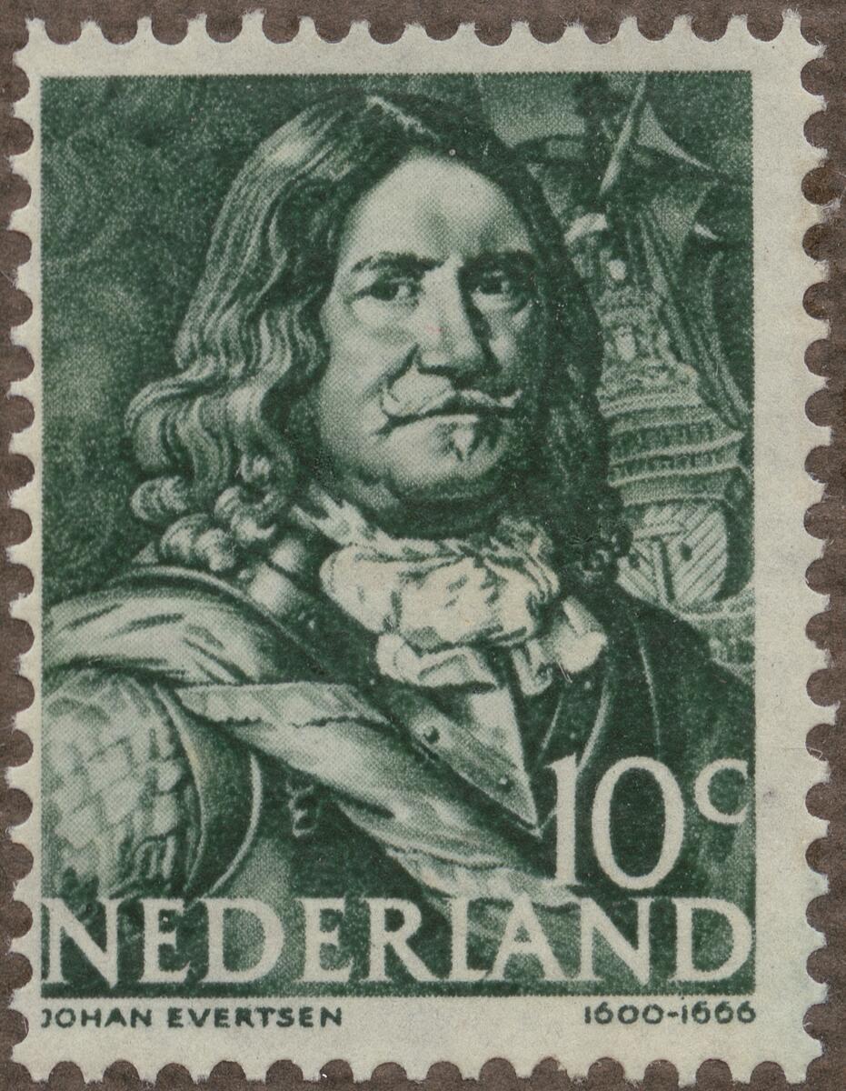 Frimärke från Nederländerna, 1943. Motiv av Holländska amiralen Johan Evertsen 1600-1666 Chef för Zeelands flotta mot England. Stred mot Sverige i Öresund. Segelfartyg i bakgrunden