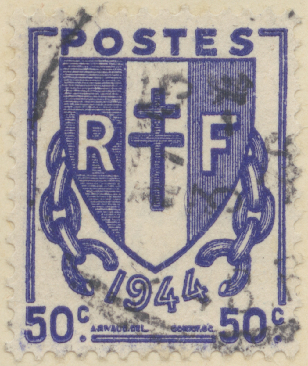 Frimärke från Frankrike, 1945. Motiv av Symboliskt Vapen: Brutna kedjor och Lorraine korset -Minne av Frankrikes frigörelse efter världskrig II: 1945-