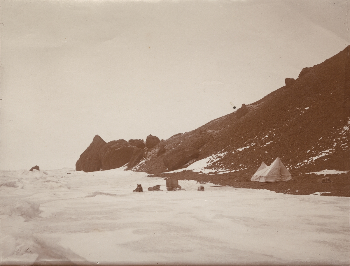 Fotografi från första svenska Antarktisexpeditionen 1901-1904. Motiv av tält och hundspann nedanför ett berg.