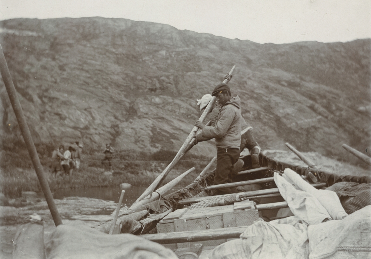 Fotografi från expedition till Grönland. Motiv av fiskare i fiskebåt nedanför ett berg.