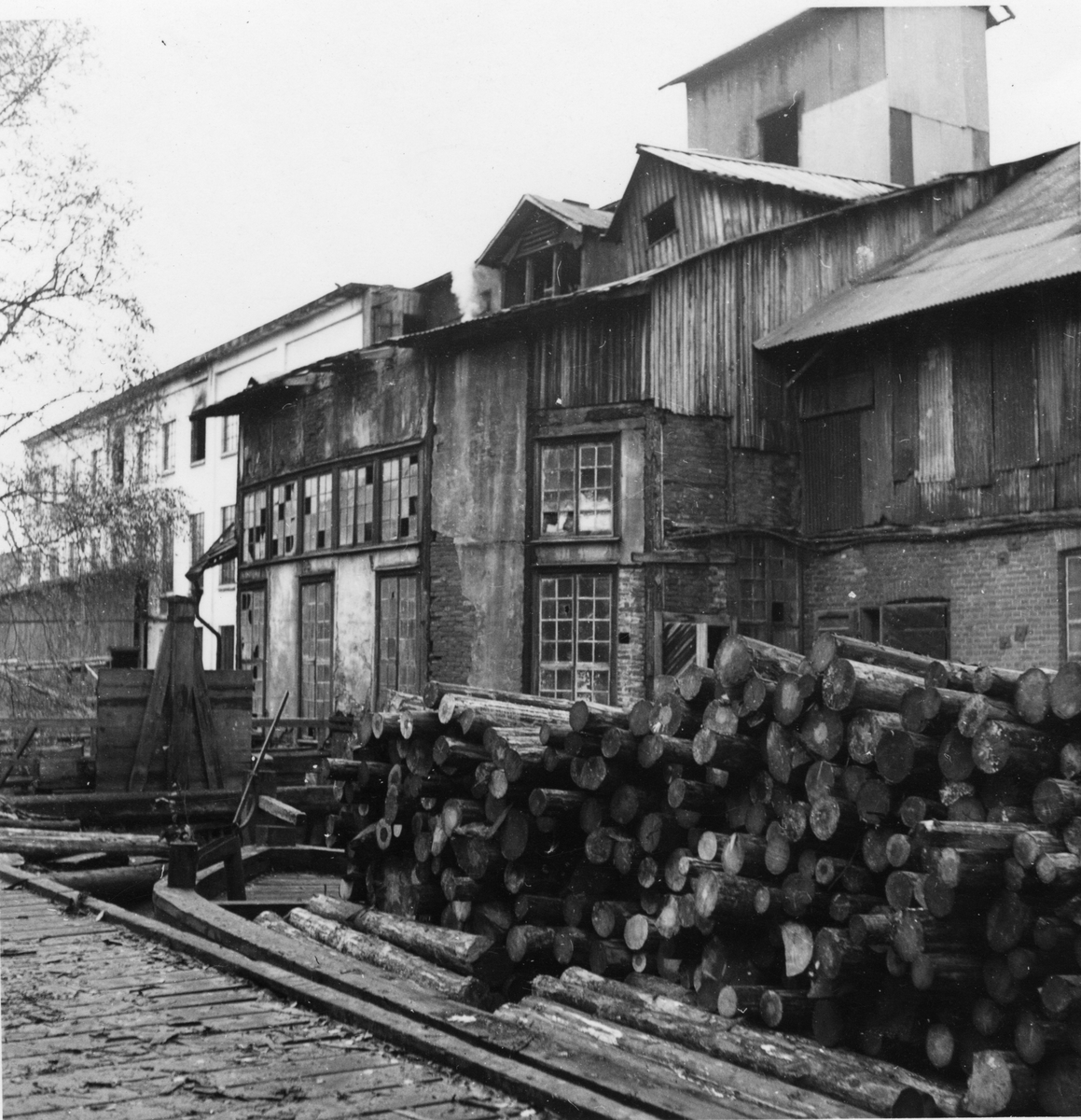 Gustafsfors Fabrikers Aktiebolag. Sulfatfabrik. Till vänster nya kokeriet, till höger gamla kokeriet och tvätteriet. I förgrunden lastbrygga och en lastad vedfärja.