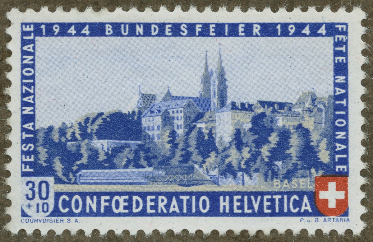 Frimärke från Schweiz, 1944. Motiv av katedralen i staden Basel. "Till schweiziska nationaldagen".