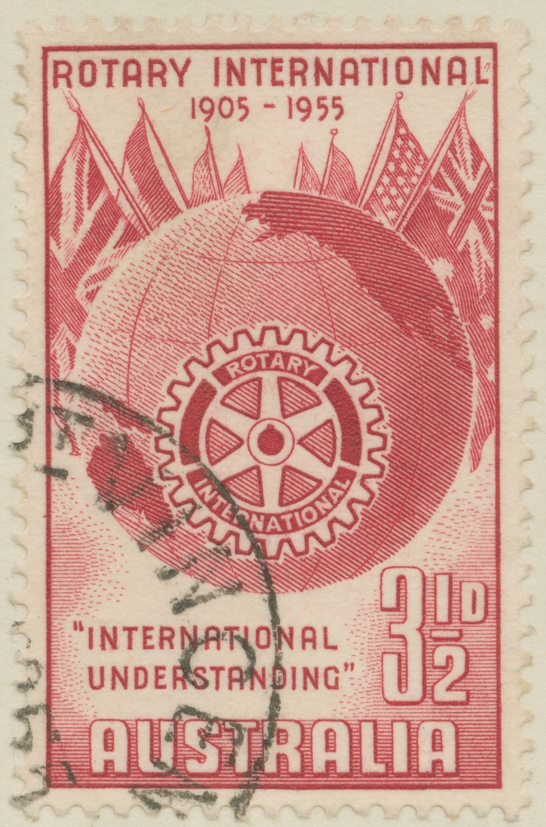 Frimärke från Australien, 1955. Motiv av jordklot med Rotarysymbol. "Internationella Rotary Klubben 50 år 1905-1955".