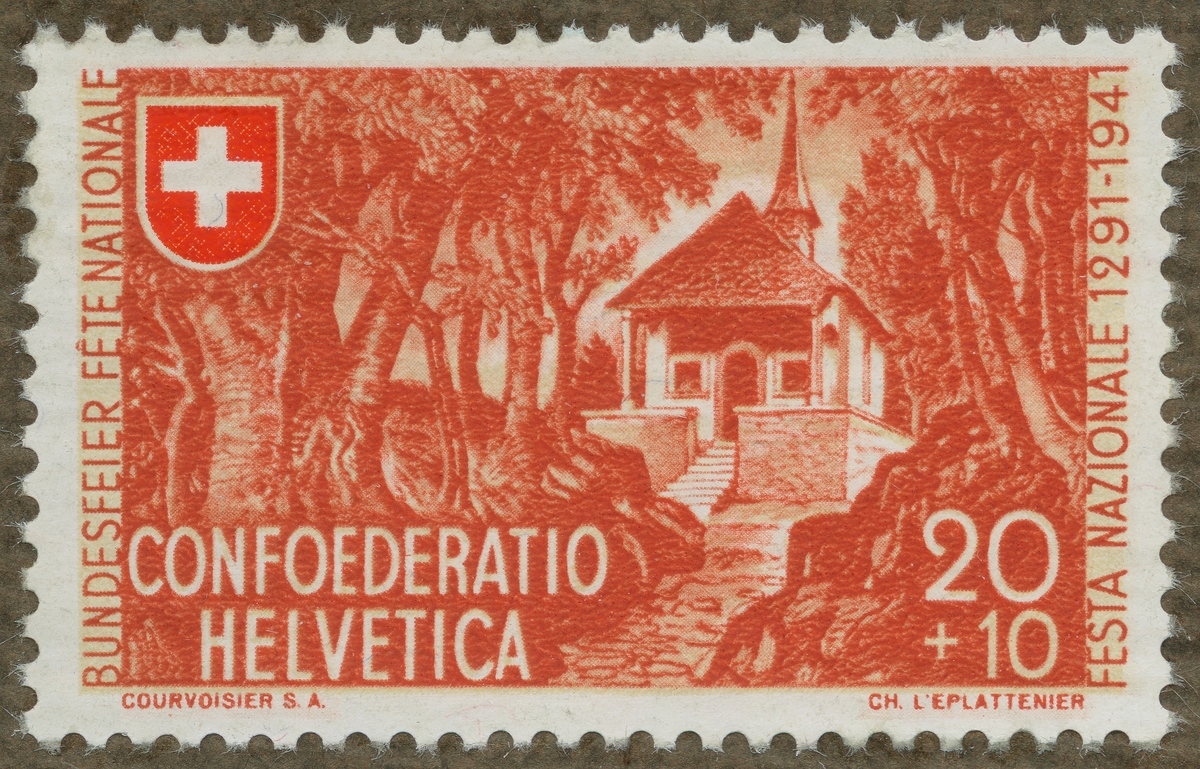 Frimärke från Schweiz, 1941. Motiv av Vilhelm Tell Kapellet. "Schweiziska nationaldagen: 650-årsminne av Schweiz oavhängighet 1291-1941- Till förmån för välgörenhetsarbetet".