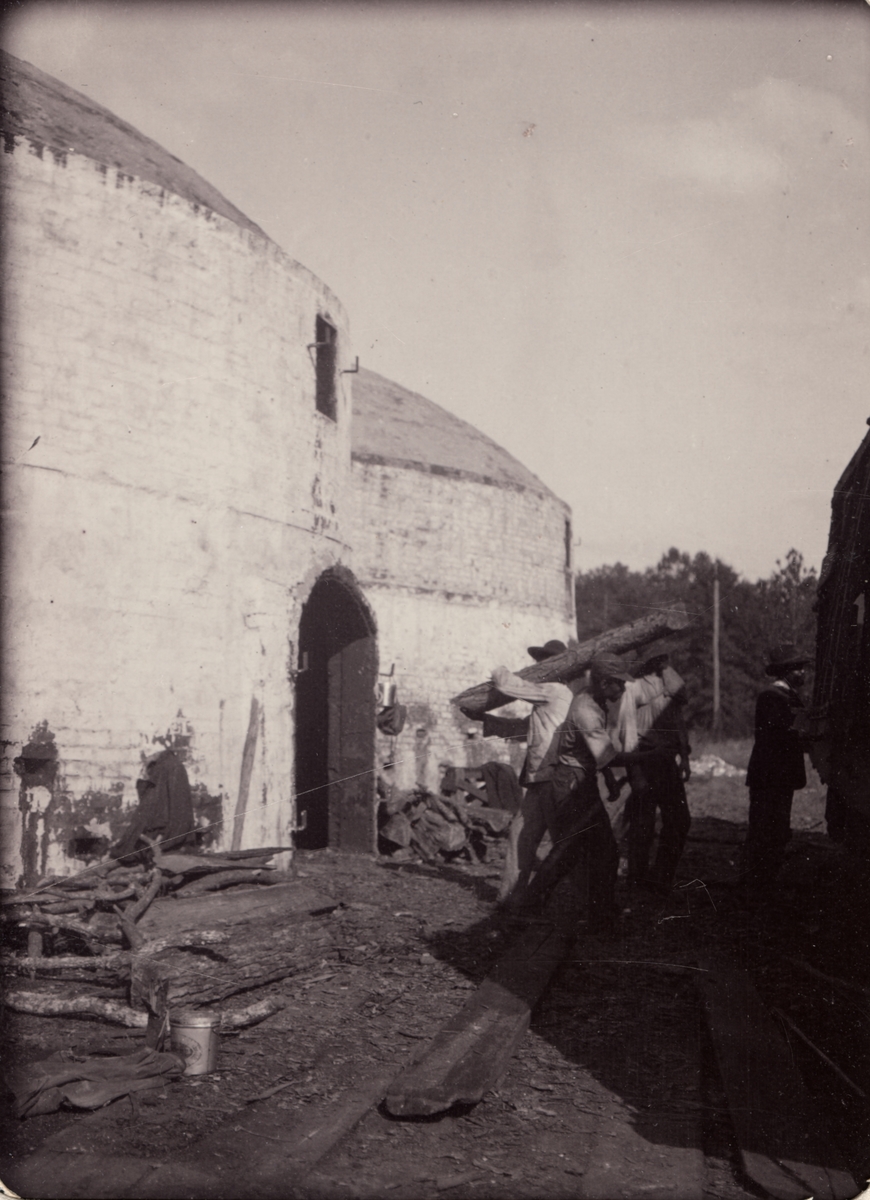 Fyllande af (av) bikup-kolugn. (Michigan). Ur album Fotografier från amerikanska Träkolshyttor 1905/1906.