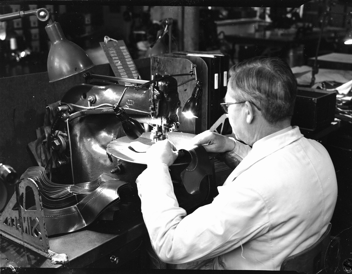Bild från skofabrik. Man syr i läder.