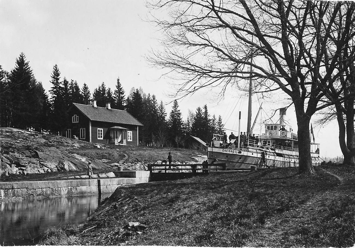 Kanalbåten Örebro II vid slussen vid Notholmen, Hjälmare kanal. Bild från tidskriften Hemmets bildmaterial.