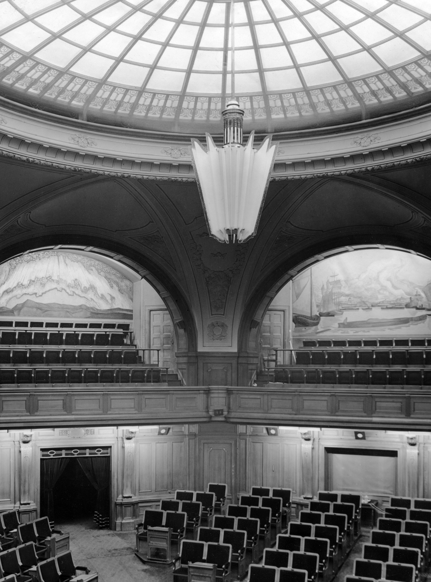 Elektriska maskiner. Från installationen av Luma lysämnesrör i riksdagens andra kammare 1945. Såväl den stora takronan i mitten som logerna vid sidan av kopolen äro upplysta genom dess lysämnesrör.