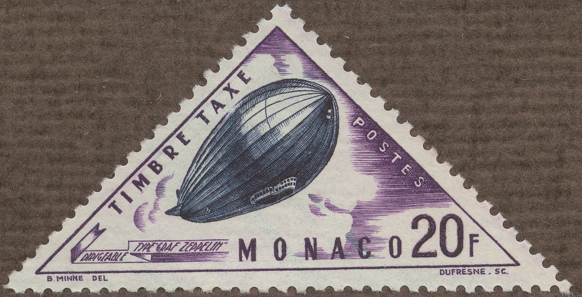 Frimärke från Monaco, 1953. Motiv av Styrbar luftballong Zeppelin- typ
