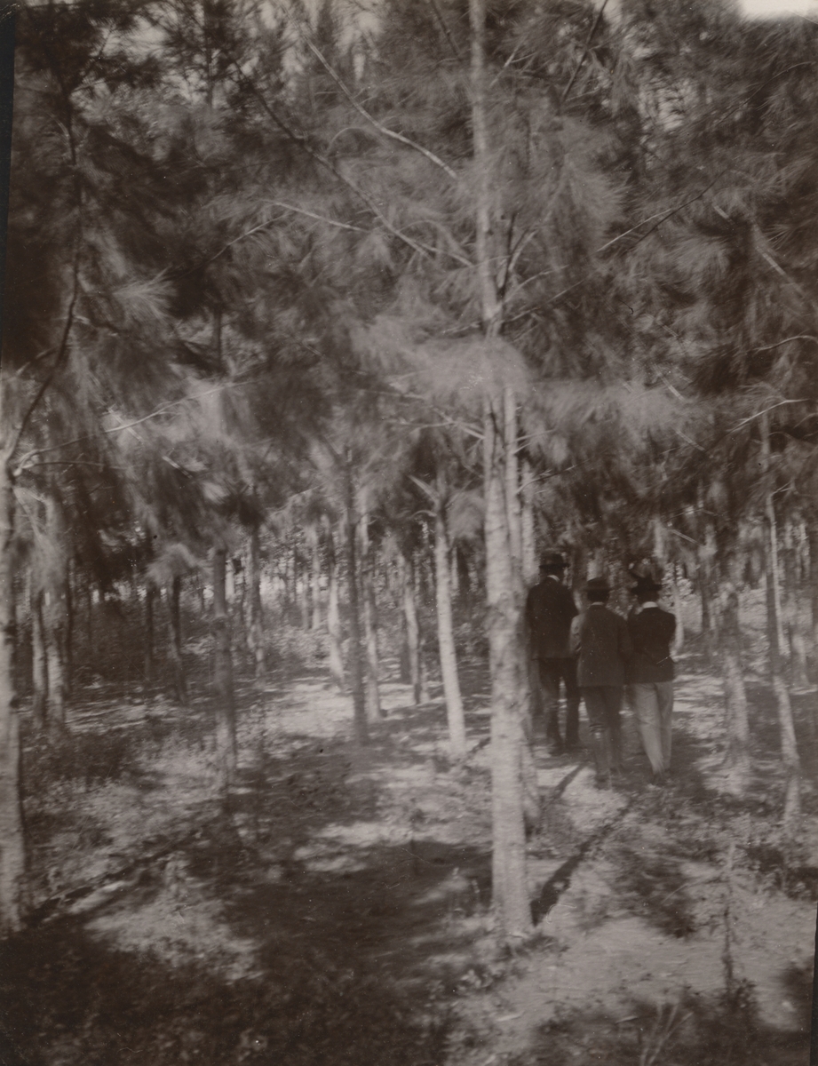 Fotografi från expedition till Peru 1920. Motiv av tre män i en gles skog.