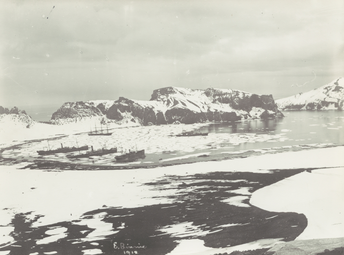 Bild från expedition i Antarktisområdet. Vy över Whale's Bay på Deception Island (en ö i Sydshetlandsöarna), 1912.