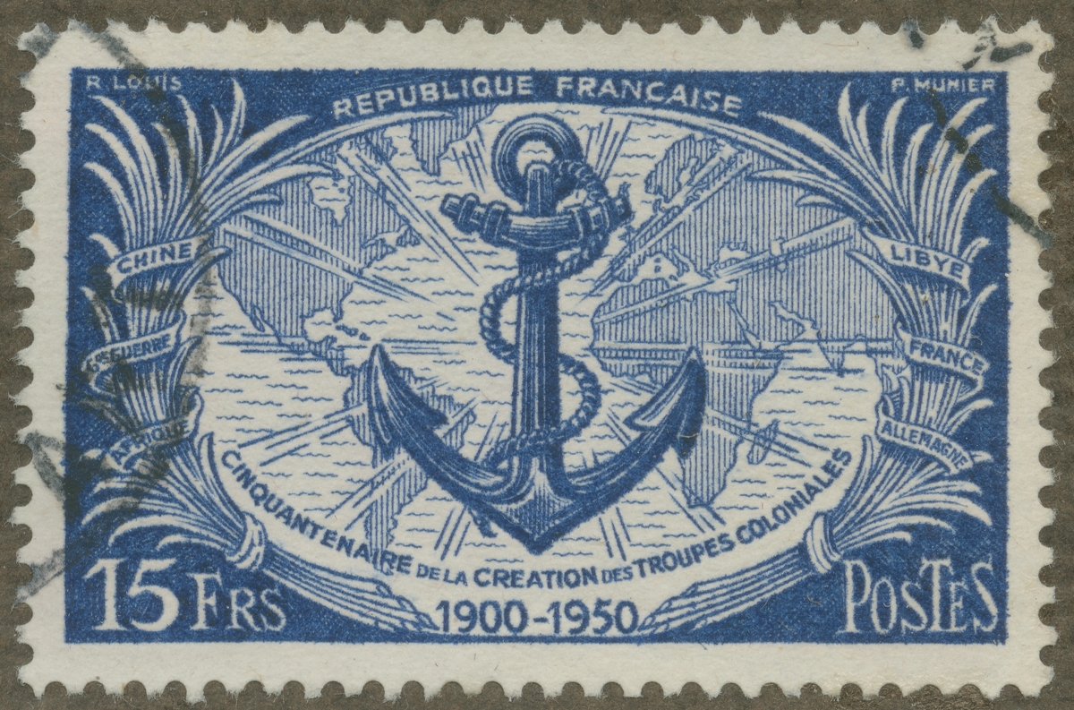 Frimärke från Frankrike, 1951. Motiv av världskarta. Ankare. Symboler för Frankrikes kolonier. "50-årsminne av koloni-truppernas stiftande 1900-1950".