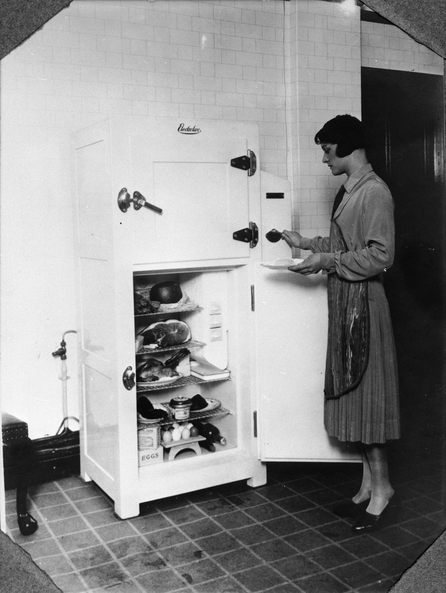 Elektrolux kylskåp, öppet. Kvinnlig demonstratör.