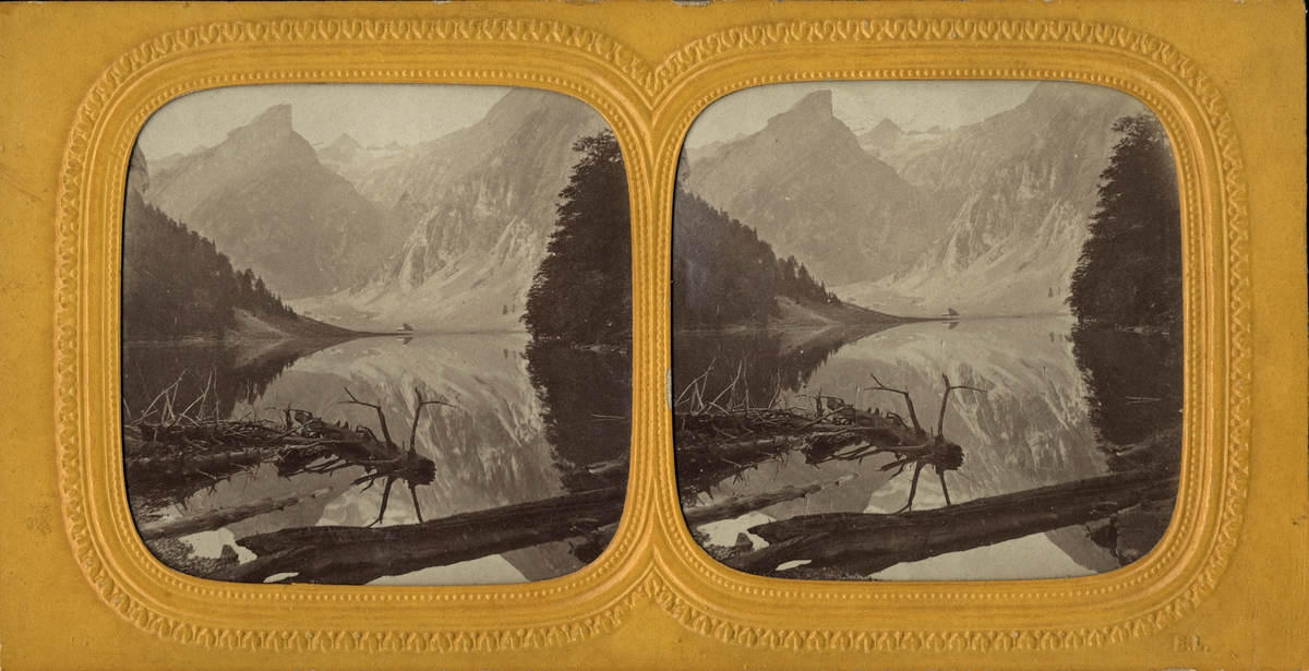 Stereobild av sjö invid berg med flytande träd. Okänd plats.