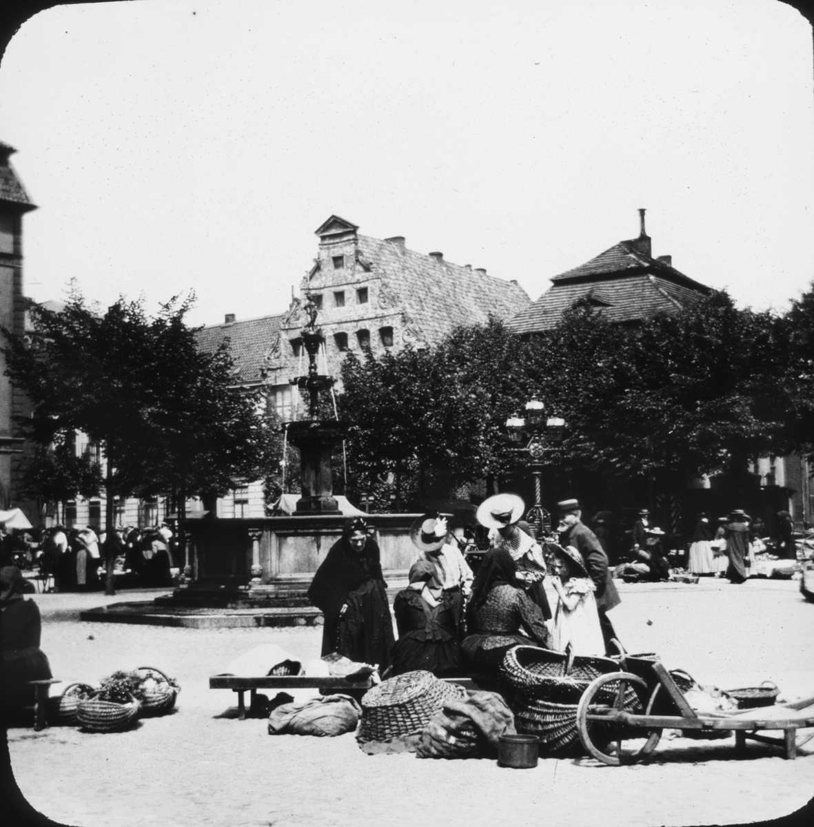 Skioptikonbild med motiv av kvinnor med korgar vid Luna-Brunnen på torget i Lüneburg.