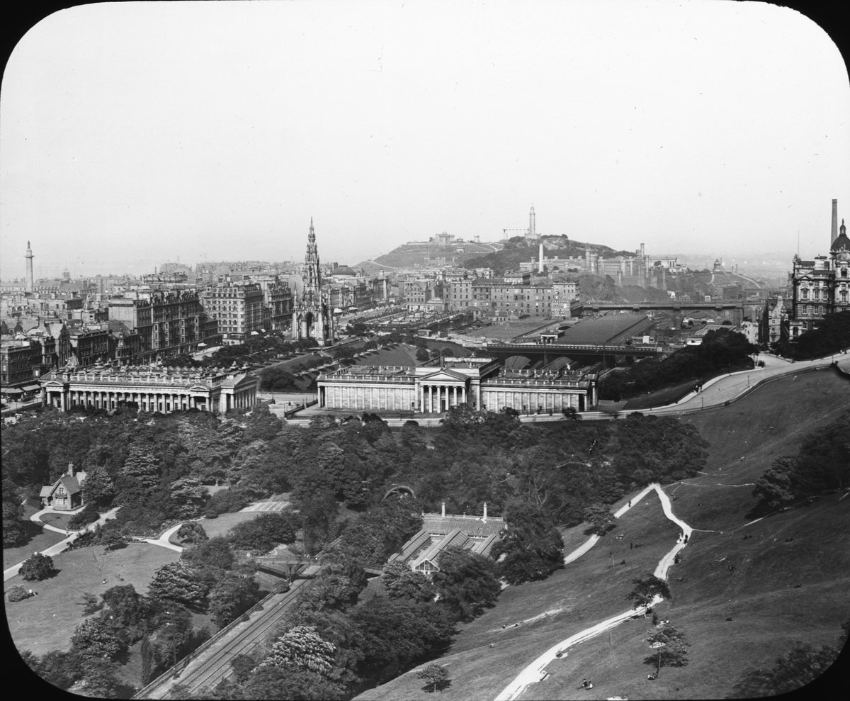 Skioptikonbild med motiv av utsikt över Edinburgh, Scotland, Storbritannien. Bilden är tagen från berget där Edinburgh Castle ligger.