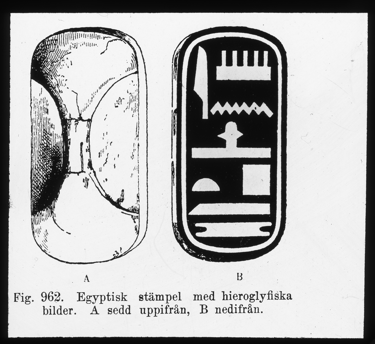 Egyptisk stämpel med hieroglyfiska bilder. A sedd uppifrån, B nedifrån.