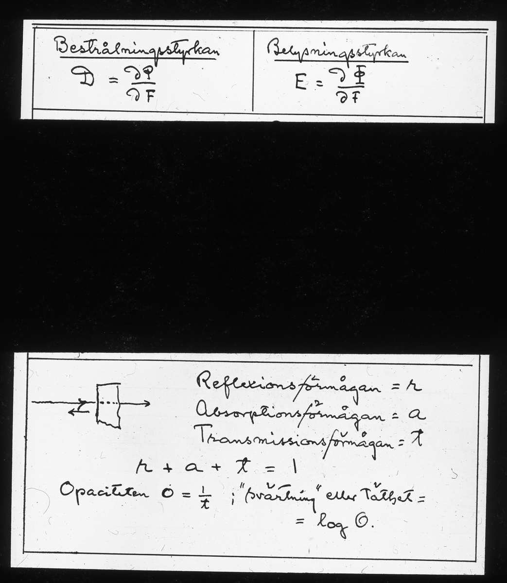 Skioptikonbild från Institutionen för fotografi vid Kungliga Tekniska Högskolan. Använd av professor Helmer Bäckström som föreläsningsmaterial. Bäckström var Sveriges första professor i fotografi vid Kungliga Tekniska Högskolan i Stockholm 1948-1958.