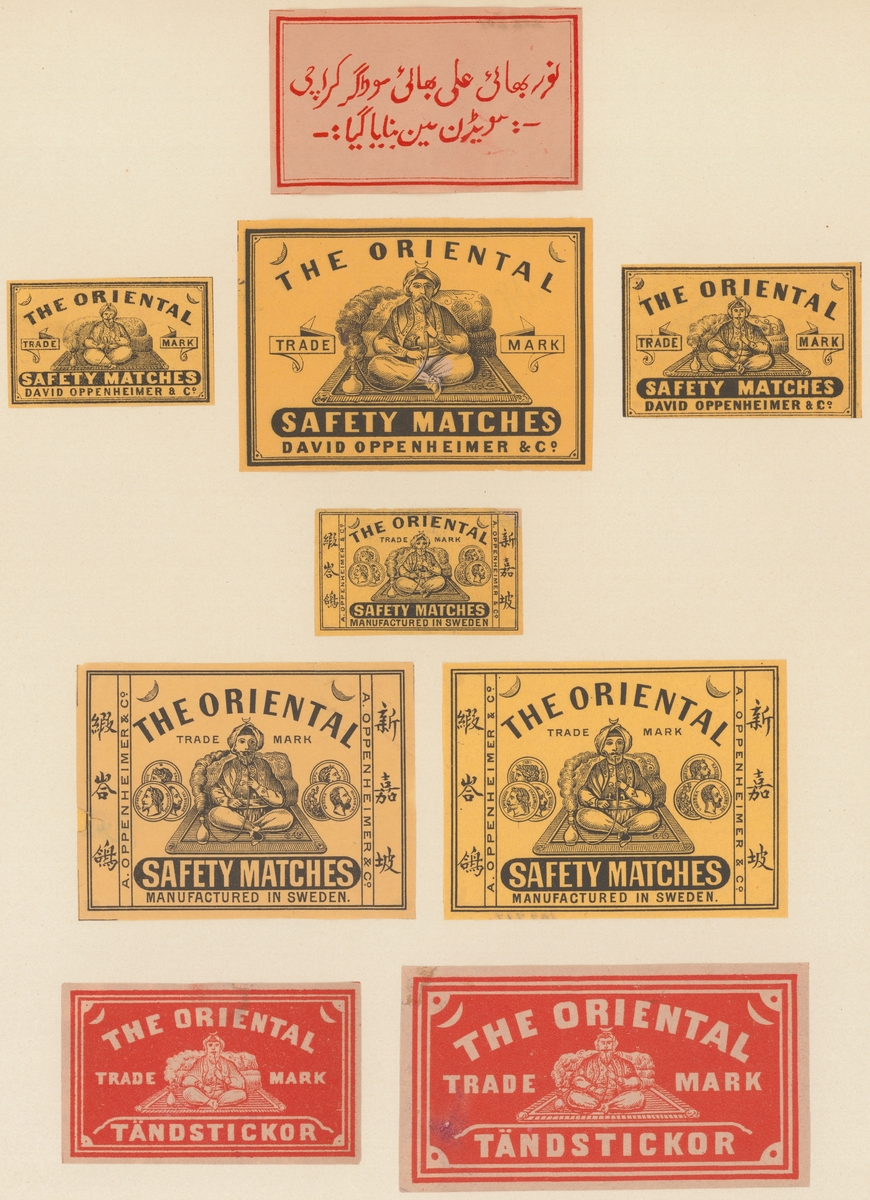 Etiketter för tändsticksaskar, från Svenskt Industri- och Handelsmuseum.