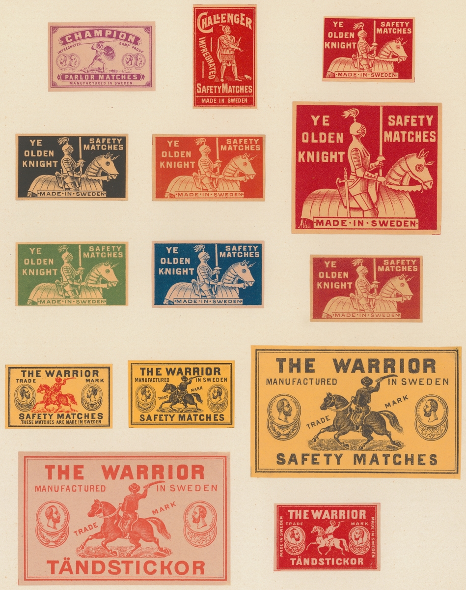 Etiketter för tändsticksaskar, från Svenskt Industri- och Handelsmuseum.