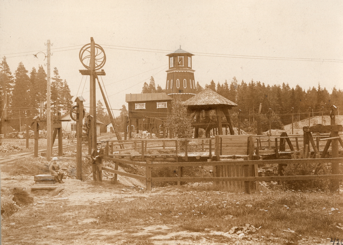 Motiv från Stribergs Gruva, Västmanland. Skrädhus och gruvöppning.