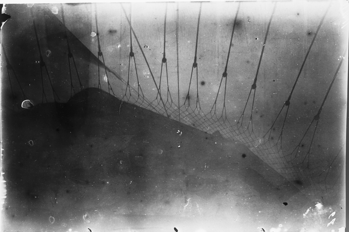 En bit av ballongen och dess linor. Framtagning av bilderna gjordes av docent John Hertzberg år 1930 på Fotografi, Tekniska Högskolan.