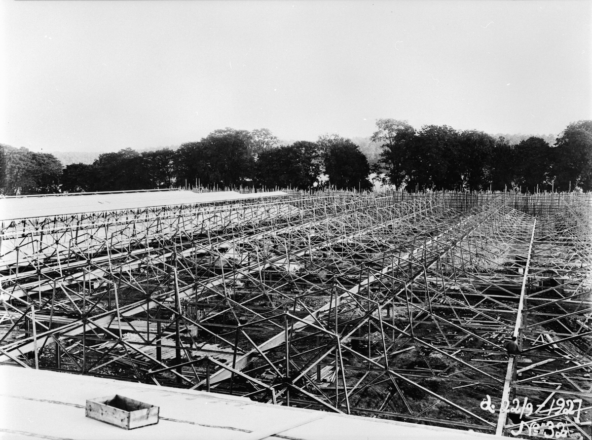 Titel: Byggherre: Bygnadaktiebolaget Contractor, Stockholm. General Motors Nordiska AB:s första fabriksbyggnad i Sverige. Arbetsbild. Hammarbyhamnen 1927.