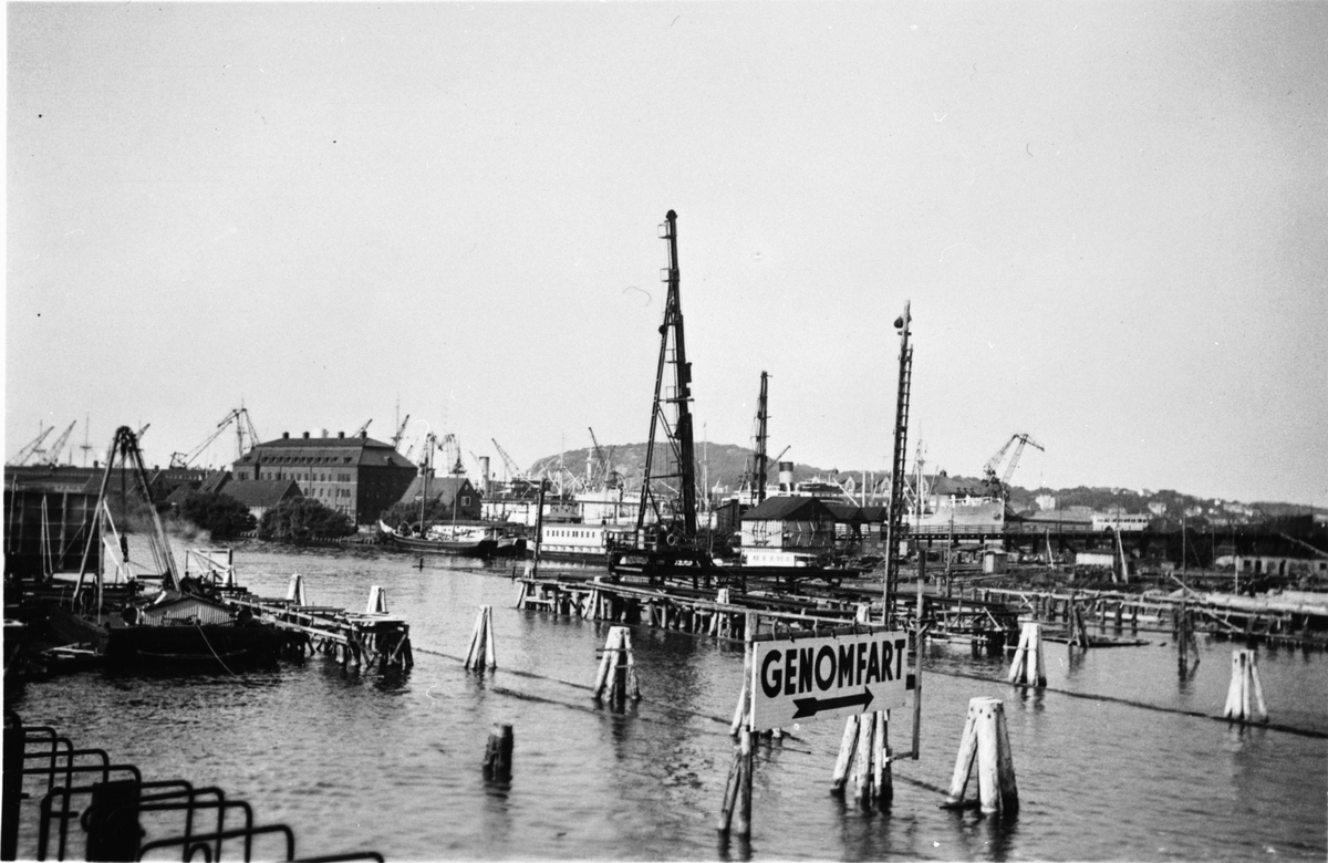 Titel: Byggherre: Byggnadsaktiebolaget Contractor, Stockholm. Götaälvsbron. Arbetsbild av påbörjade bropelare ute i älven.