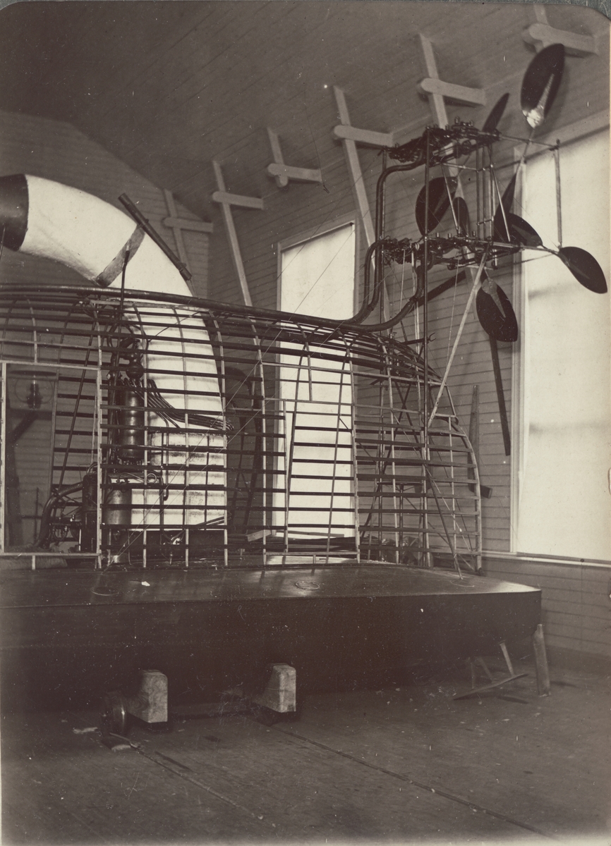 Flygbåten Hydran under konstruktion i C. R. Nybergs verkstad vid Täcka udden. Pannan och propellrarna monterade.