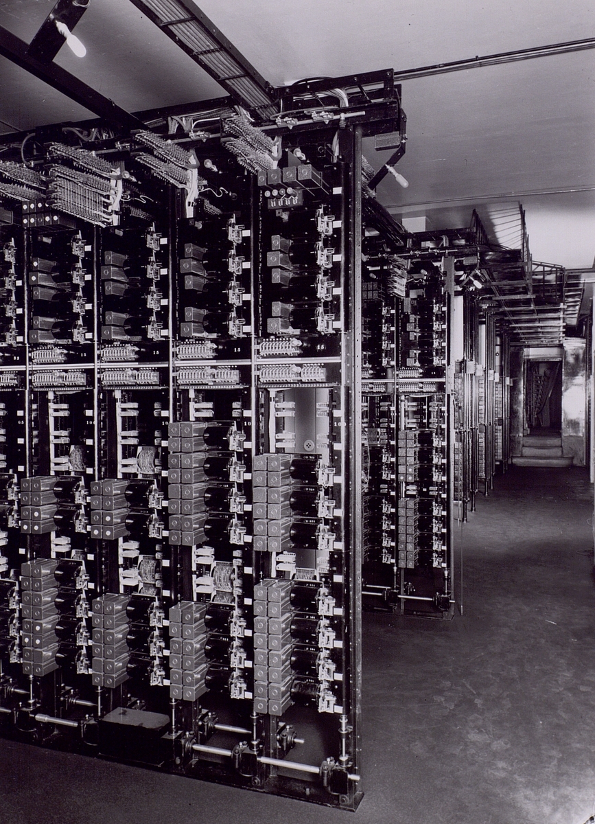 Malmskillnadsgatan 30. Ljussignalstativ samt abonnent- relästativ och väljarestativ för II- och IV-grupperna. Nya över kopplingsalen.