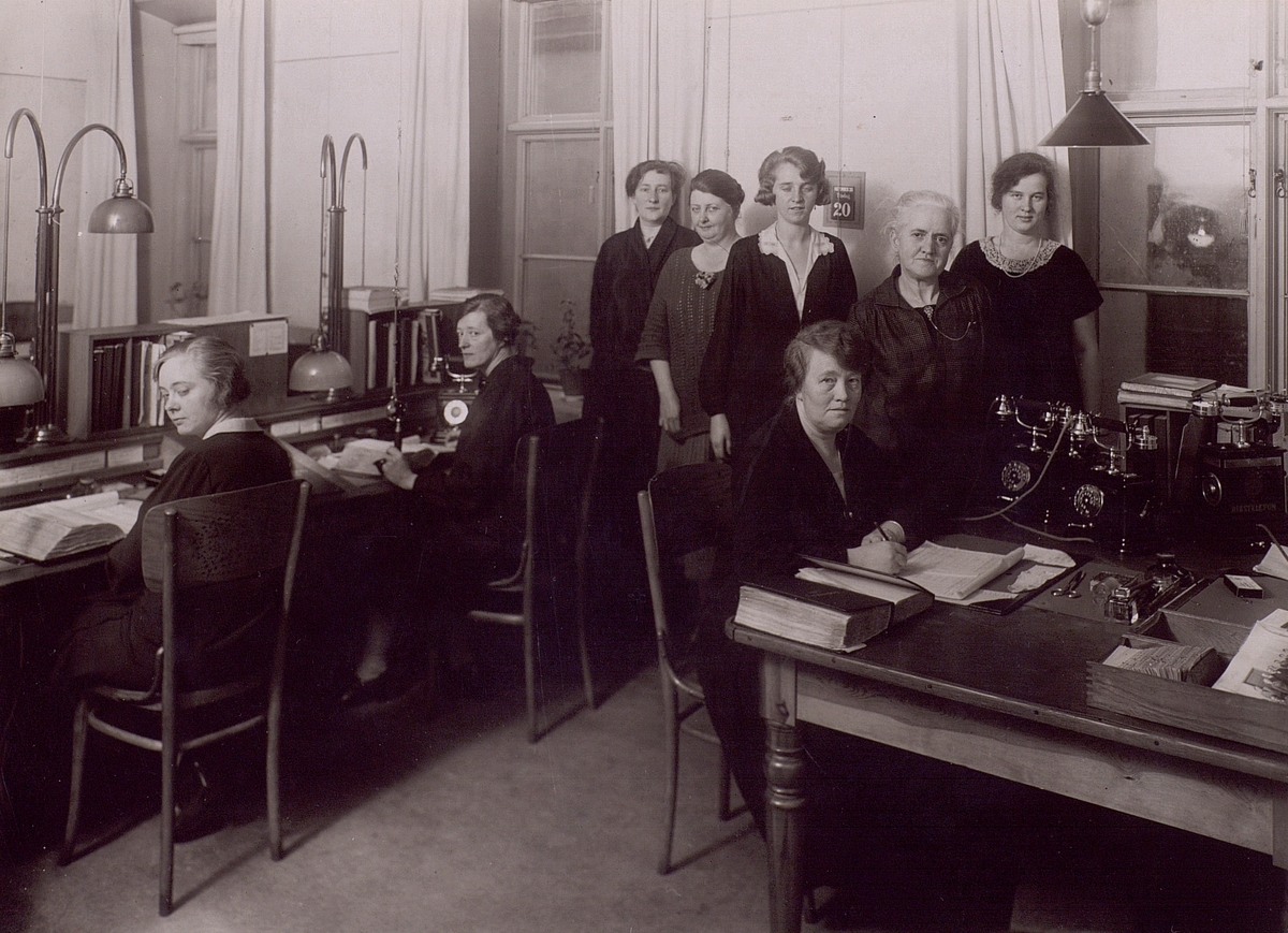 Interiör, troligen från katalogredaktionen, 1920-talet, vid bordet i förgrunden Beda Cederberg.