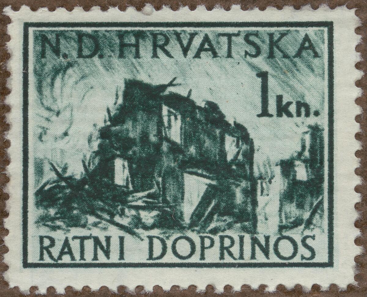 Frimärke från Kroatien, 1943-44. Motiv av Krigshärjat hus i Kroatien -Till förmån för krigsoffren-