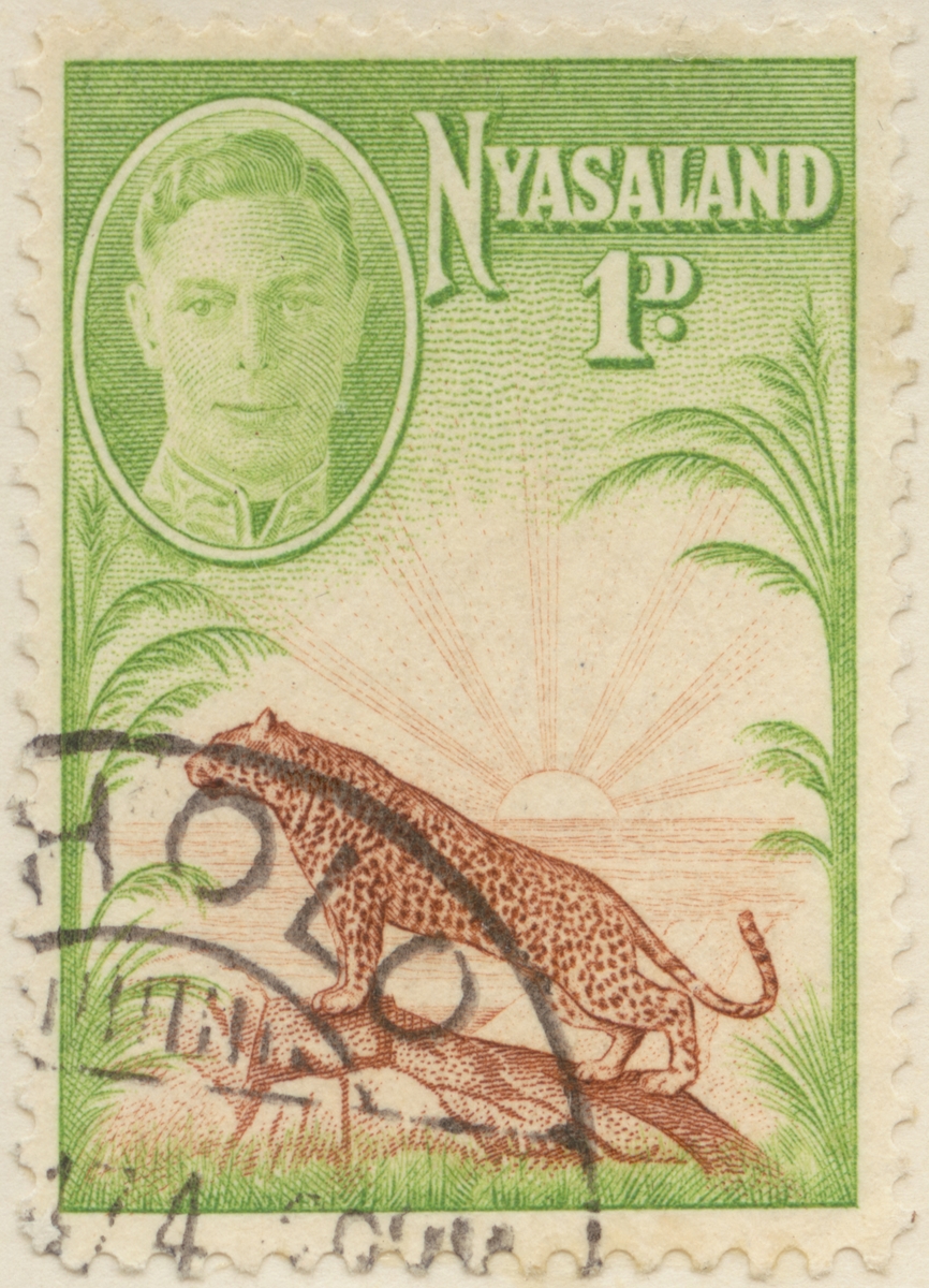 Frimärke från Nyasaland, 1947. Motiv av Leopard -Kung George VI-