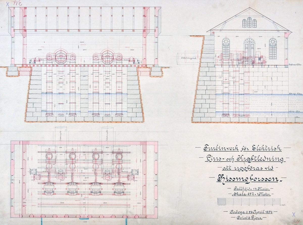 Ritning. Turbinverk för Elektrisk ljus- och kraftledning att uppföras vid Hissmoforssen.